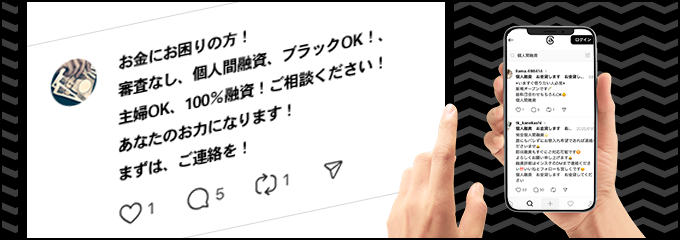 現代のヤミ金が主戦場としているのは、SNSの世界です。Twitter(X)やLINEなどで「#個人間融資」と検索すれば、簡単にお金を貸してくれるという投稿が見つかります。福岡市だけでなく、糸島市や宗像市、古賀市、福津市といった郊外の街に住む世代にとっても身近な問題です。